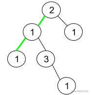 解释:上图为给定二叉树。总共有 3 条从根到叶子的路径:绿色路径 [2,1,1] ,路径 [2,1,3,1] 和路径 [2,1] 。