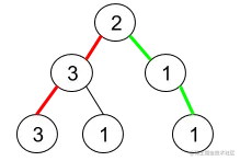 解释:上图为给定的二叉树。总共有 3 条从根到叶子的路径:红色路径 [2,3,3] ,绿色路径 [2,1,1] 和路径 [2,3,1] 。