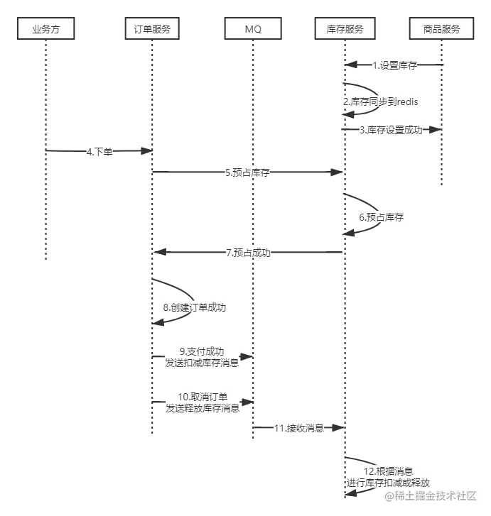 创建订单时预占库存,预占成功,则进行订单创建。 用户支付成功后,发送扣减库存消息到MQ,库存服务进行库存真正扣减; 订单取消,发送释放库存消息到MQ,库存服务释放库存。