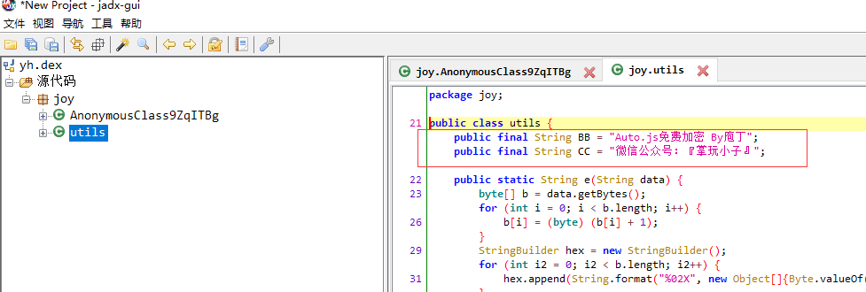 如何加密的呢? 用原来的js先加密(加密算法很简单),再生成字节码的dex,加密复杂了生成dex会有问题。 找到 ‘庖丁’就可以了! 我们没有那么做,我抓了包,分析出了一个下载 dex的网址。和一个注册码验证接口。