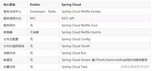 微服务的核心要素在于服务的发现、注册、路由、熔断、降级、分布式配置,基于上述几种必要条件对 Dubbo 和 Spring Cloud 做出对比。
