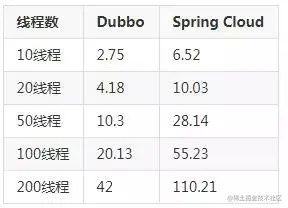 使用一个 Pojo 对象包含 10 个属性,请求 10 万次,Dubbo 和 Spring Cloud 在不同的线程数量下,每次请求耗时(ms)如下: