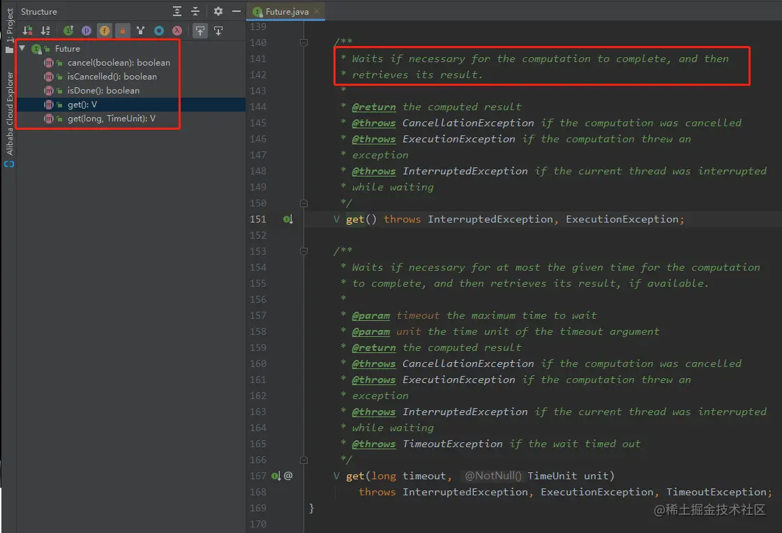 而从这个方法的描述可以看出,这是一个阻塞方法。拿不到值就在那里等着。当然,还有一个带超时时间的 get 方法,等指定时间后就不等了。