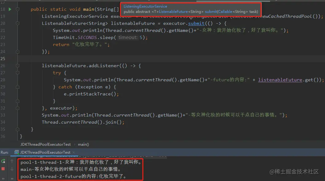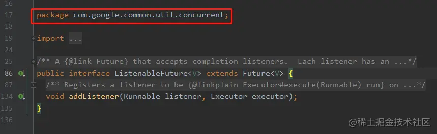 然后用装饰后的 executor 调用 submit 方法(任意一种),就会返回 ListenableFuture ,拿到这个 ListenableFuture 之后,我们就可以在上面注册监听: