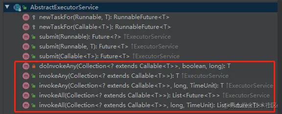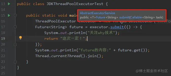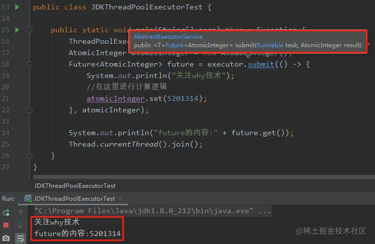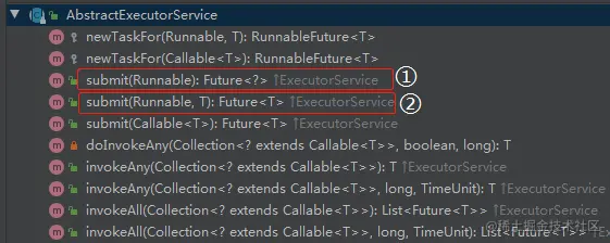 标号为 ② 的方法扔进去一个 Runable 的任务的同时,再扔进去一个泛型 T ,而巧好返回的 Future 里面的泛型也是 T,那么我们大胆的猜测一下这就是同一个对象。如果是同一个对象,说明我们可以一个对象传到任务体里面去一顿操作,然后通过 Future 再次拿到这个对象的。一会就去验证。