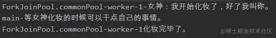 System.out.println(Thread.currentThread().getName() + "-女神:我开始化妆了,好了我叫你。");