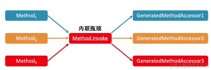 到这里,我们基本上把反射调用的水分都榨干了。接下来,我来把反射调用的性能开销给提回去。首先,在这个例子中,之所以反射调用能够变得这么快,主要是因为即时编译器中的方法内联。在关闭了 Inflation 的情况下,内联的瓶颈在于 Method.invoke 方法中对MethodAccessor.invoke 方法的调用。