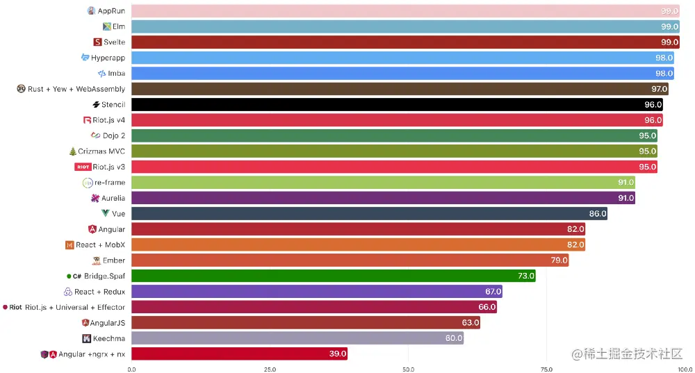 Lighthouse评分非常实事求是。今年你可以看到,那些没有维护/更新的应用正在从90的悬崖上掉下来。如果你的应用得分>90,可能不会有成吨的差别。话说AppRun、Elm和Svelte真的令人印象深刻。