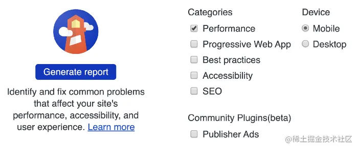 我们将检查Chrome浏览器附带的Lighthouse Audit的性能评分。Lighthouse的性能得分在0到100之间。0为最低分。更多详情请查看Lighthouse评分指南。