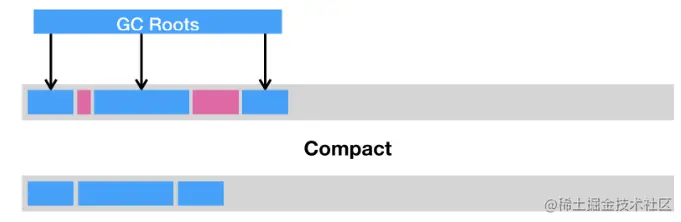 第二种是压缩(compact),即把存活的对象聚集到内存区域的起始位置,从而留下一段连续的内存空间。这种做法能够解决内存碎片化的问题,但代价是压缩算法的性能开销。