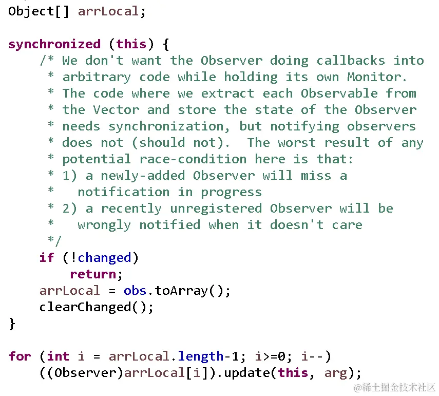 在使用java提供的Observable类时有一个注意点,在Observable类中有一个changed属性用来记录数据是否已经变化,当调用它的notifyObservers方法时,只有在changed数据为true时才会通知观察者,所以在调用notifyObservers方法之前要先调用一下setChanged方法将changed设为true(这样做是为了避免主题对数据过于敏感,导致频繁向观察者发送消息的情况,如此例的气象站温度数据变化很频繁,其实不需要每次微小变动都通知观察者,可以在变化温度查过一度时再通知观察者)。
