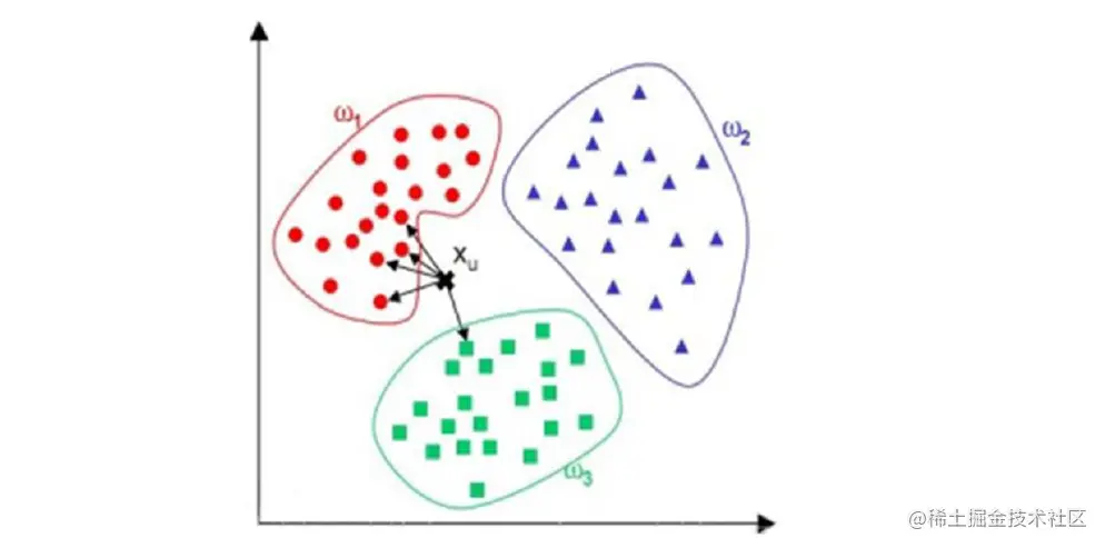 - KNN法:又称K近邻法(1967年),核心思想是如果一个样本的前k个最相邻的样本大多属于某个类别,则该样本也属于这个类别,属于有监督的学习方法,可做分类、回归。