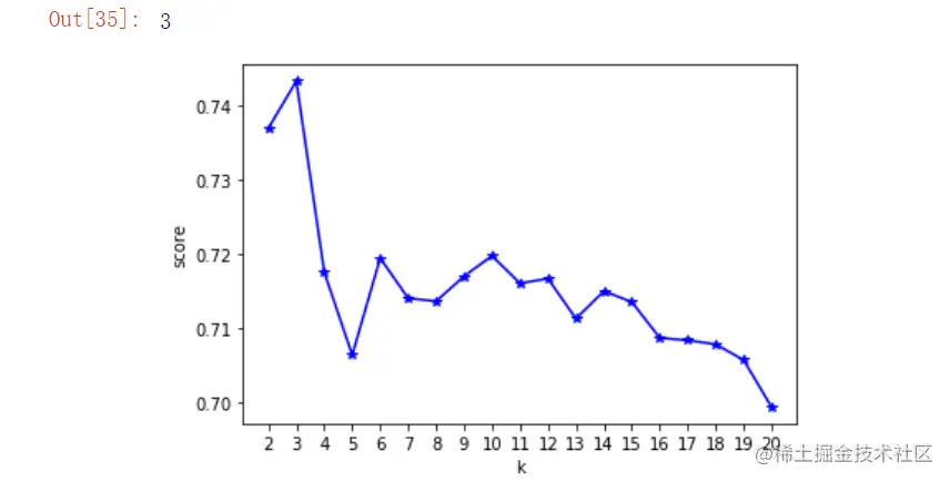 输出结果显示k=3为最优超参数,此时的score=0.765。