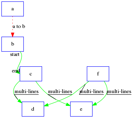 {c, f} -> {d, e} [label = "multi-lines", decorate = true] //可以用这种方式同时画多条边