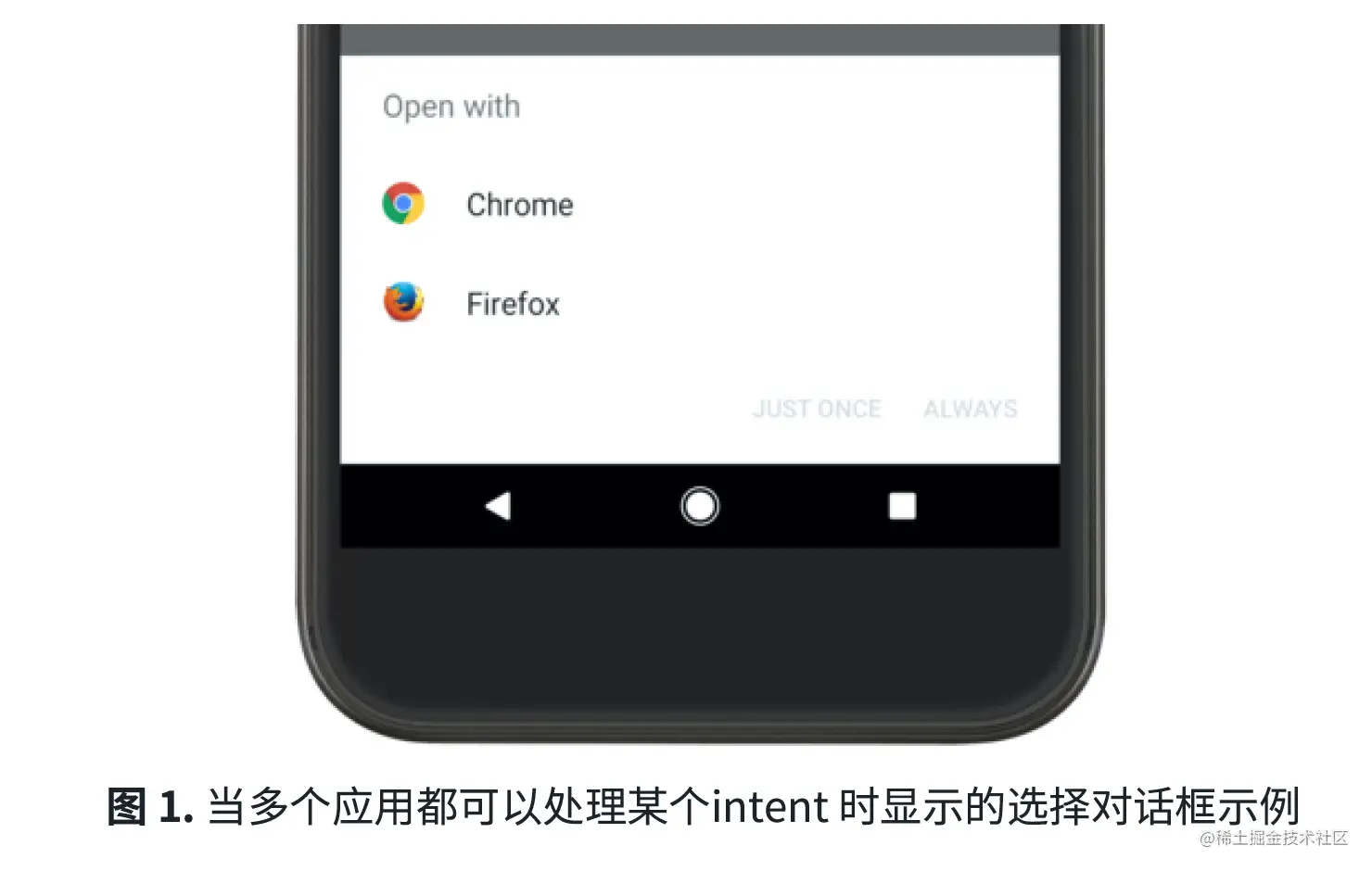 startActivity() 启动⼀个 Activity,并且有多个应⽤可以响应该 Intent 时,⽤⼾可以选择默认使⽤哪个应⽤(⻅图 1)。