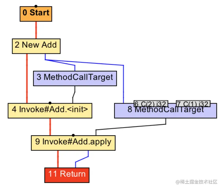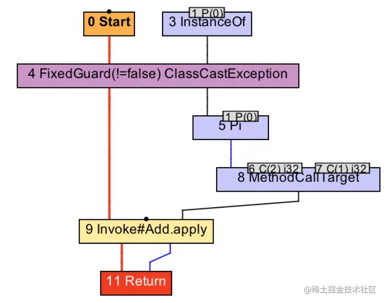在上面两张 IR 图中,方法调用的调用者(即 8 号 CallTarget 节点的第一个依赖值)分别为 2 号 New 节点,以及 5 号 Pi 节点。后者可以简单看成强制转换后的精确类型。由于这两个节点的类型均被精确为 Add 类,因此,原 invokevirtual 指令对应的 9 号 invoke 节点都被识别对 Add.apply 方法的调用。