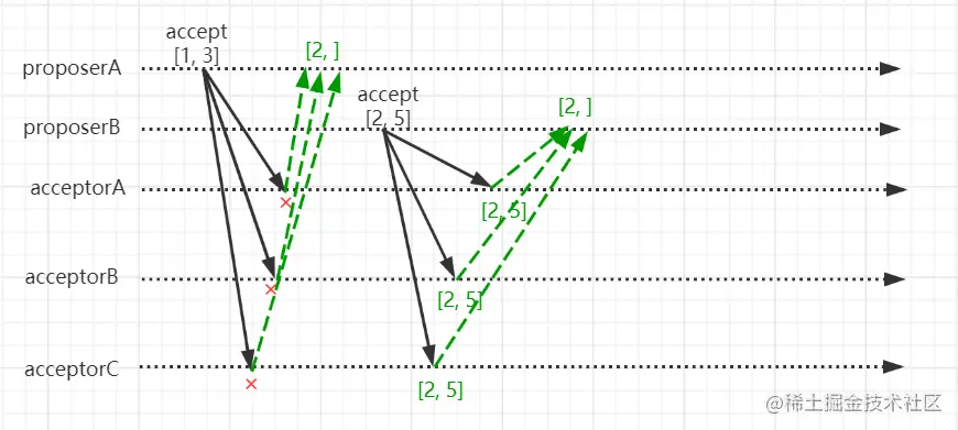 - proposerB由于收到的prepare响应中没有任何提案值,则自己任意设置提案值,也就是[2, 5]。并向各个acceptor发起accept请求。