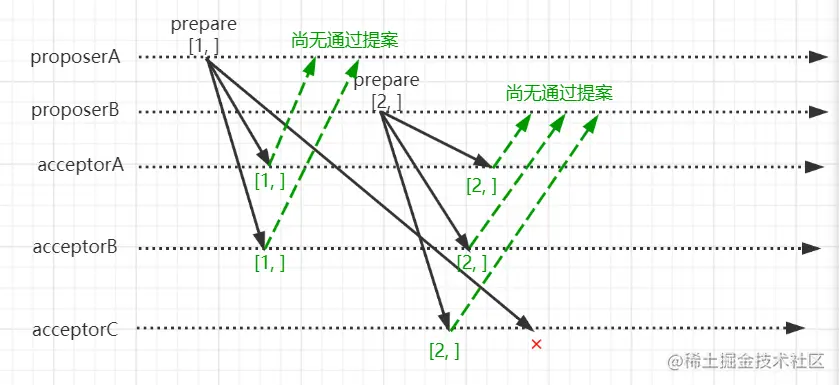 proposerA收到请求将X设置成3,proposerB收到请求将X设置成5。proposerA和proposerB分别为此生成提案,其proposerA的提案编号为1,proposerB提案编号为2。在prepare阶段它们交互结果: