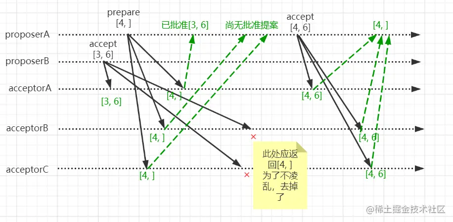 为了更好的描述该承诺,我们可以想象出这样一个场景。proposeB完成prepare请求后,发起accept请求,且提案为[3, 6]。在此过程中,proposeA发起prepare请求,提案编号为[4, ],并且acceptor先收到proposeA发起prepare请求,也就是说acceptor会拒绝proposeB的accept请求