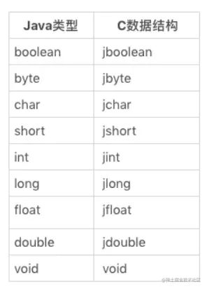 JNI 会将 Java 层面的基本类型以及引用类型映射为另一套可供 C 代码使用的数据结构。其中,基本类型的对应关系如下表所示: