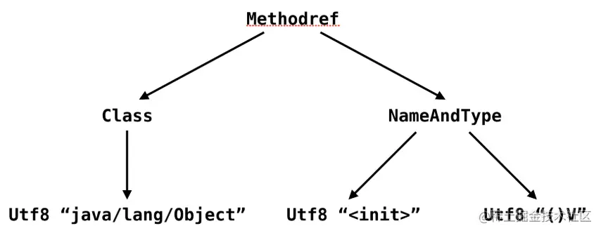举例来说,上图中的 1 号常量池项是一个指向 Object 类构造器的符号引用。它是由另外两个常量池项所构成。如果将它看成一个树结构的话,那么它的叶节点会是字符串常量,如下图所示。