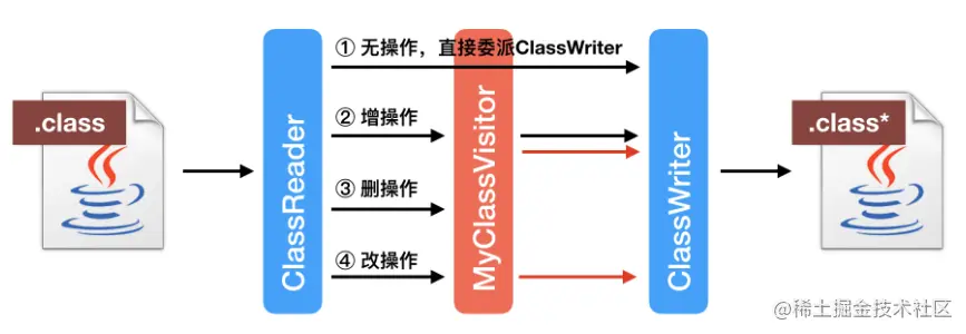 那么,如何修改这个 class 文件的字节码呢?原理很简单,就是将 ClassReader 的访问请求发给另外一个访问者,再由这个访问者委派给 ClassWriter。