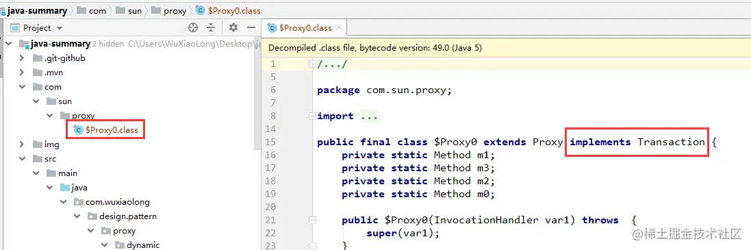 在上面$Proxy0.class字节码生成方式二,就是手动通过ProxyGenerator.generateProxyClass方法获得对Transaction.class代理的对象并输出到文件。