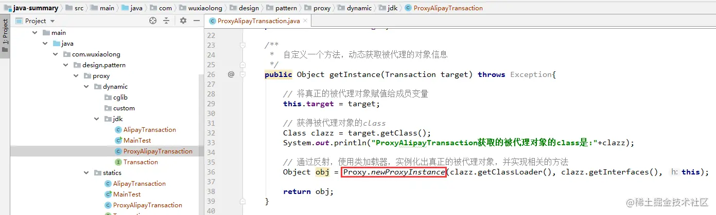 ProxyAlipayTransaction获取的被代理对象的class是:class com.wuxiaolong.design.pattern.proxy.dynamic.jdk.AlipayTransaction