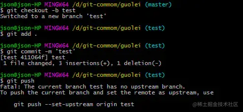 我创建了一个test分支,修改代码,直接git push 提交,他报如下的错,因为你没有指定关联,他不知道要push到远程的哪个分支上去,所以git在bash里面建议你带参数 git push origin source:target