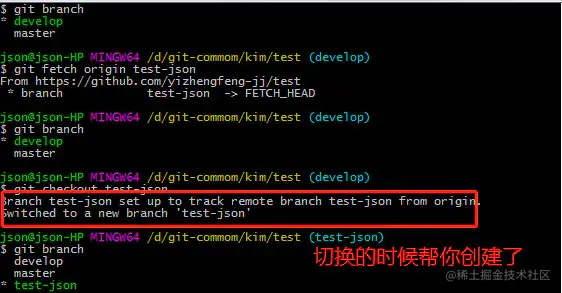 这个命令就是创建一个本地develop分支,并且关联远程库的develop分支,那么这个分支就和远程的一样,这也是我们我们常见的拉取远程分支的方法,并且这是不会合并的