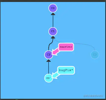 这里要注意一下,此时master分支不是新的,bugFix才是,和merge不同,此时你还要把master更新