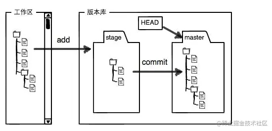 - 暂存区:暂存区在你的版本库里面,在你使用git add 的时候,git会把你工作区的修改,放到暂存区里面去