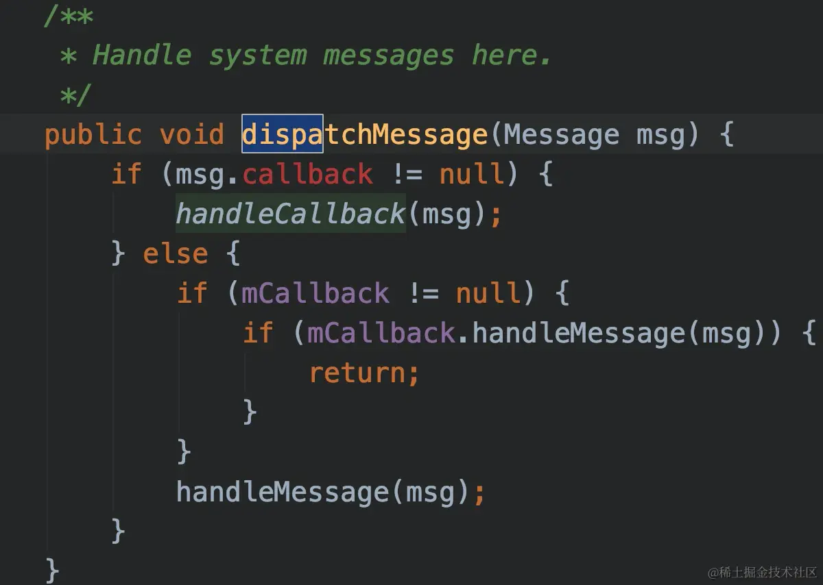 Looper从MessageQueue中取一个Message后,首先会调用Handler.dispatchMessage()进行消息的派发。
