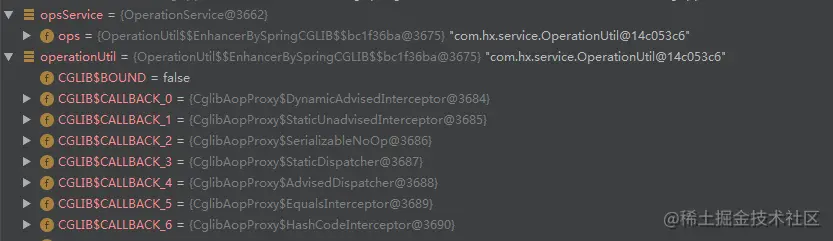 CglibAopProxy$DynamicAdvisedInterceptor说明它有AoP代理 - 它有唯一的成员变量advised,advisor位于其advisors成员变量中,这是一个List集合