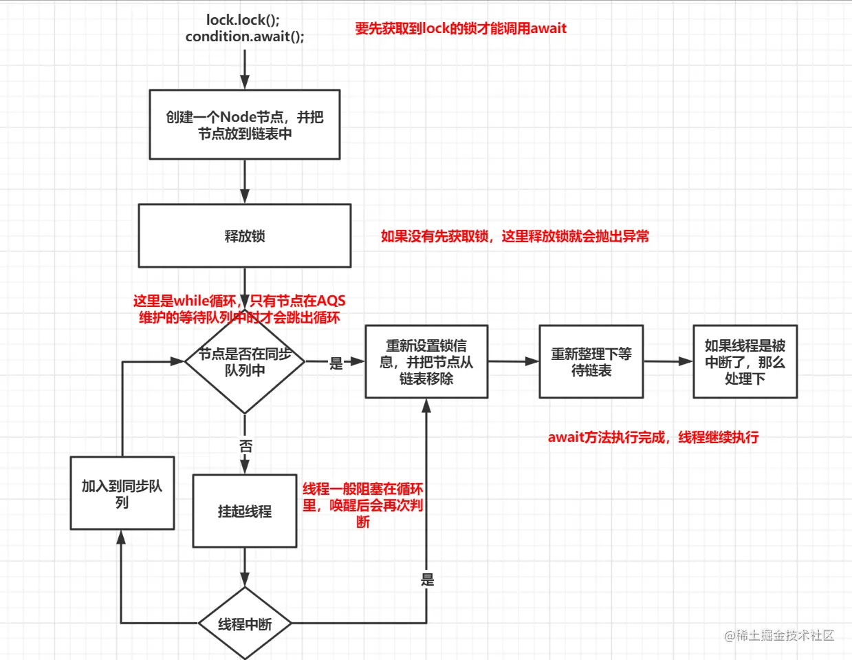 最后再梳理下Condition的await、signal方法,再使用await方法之前必须调用Condition对应的ReentrantLock的lock方法,也就是必须要获取锁。线程要跳出await方法就必须把节点放到AQS中的同步队列中。而signal方法就是把节点放到同步队列中。