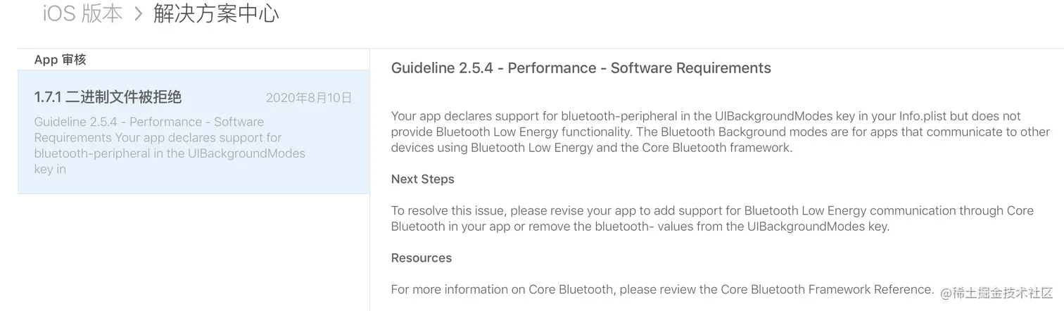 To resolve this issue, please revise your app to add support for Bluetooth Low Energy communication through Core Bluetooth in your app or remove the bluetooth- values from the UIBackgroundModes key.