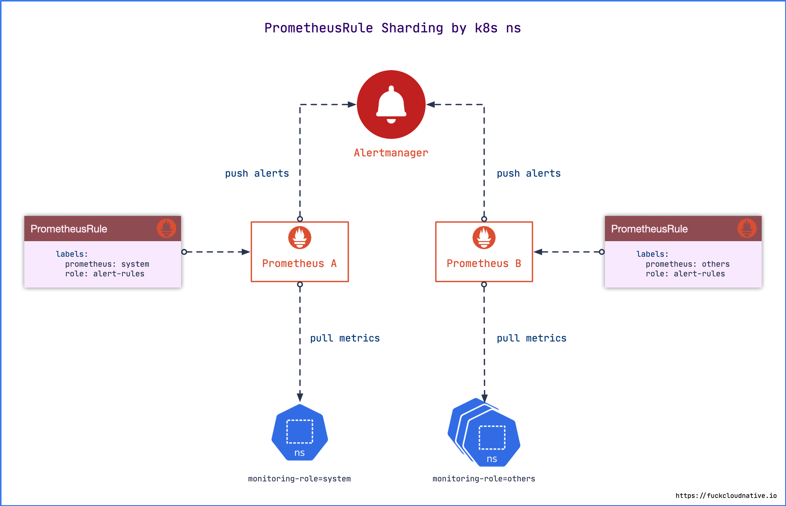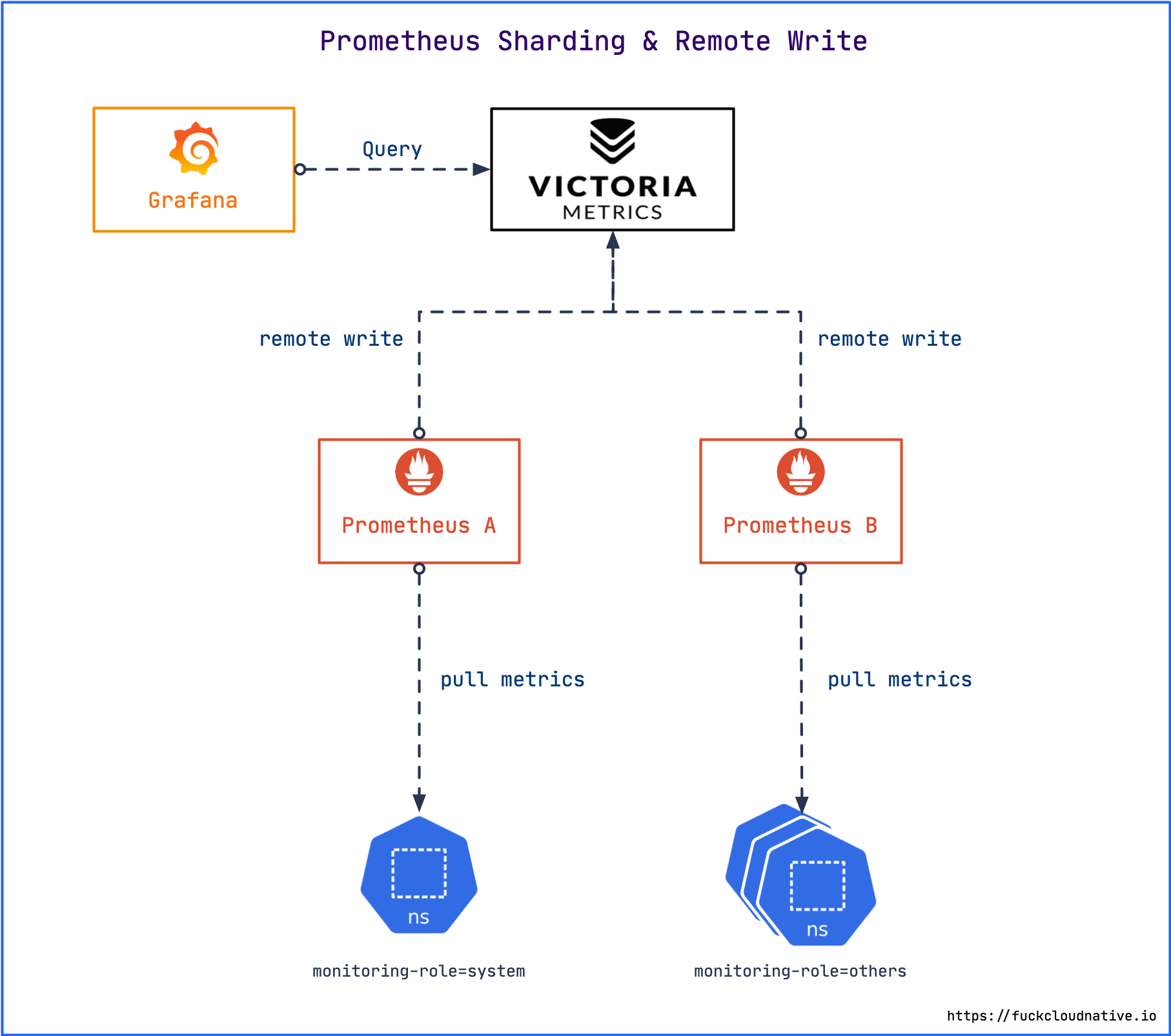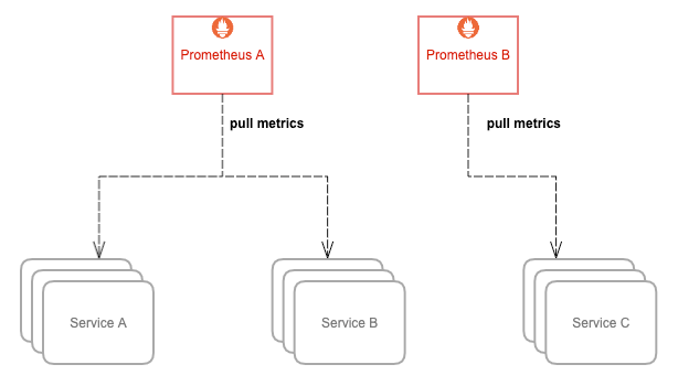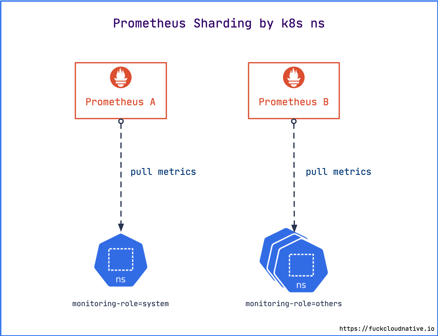 在 Kubernetes 集群中,我们可以根据 namespace 来拆分 Prometheus 实例,例如将所有 Kubernetes 集群组件相关的监控发送到一个 Prometheus 实例,将其他所有监控发送到另一个 Prometheus 实例。