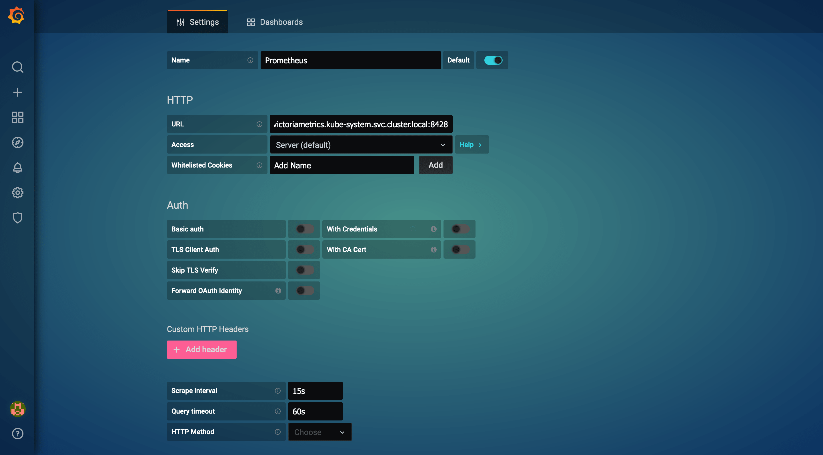 打开 Grafana 的设置页面,将数据源修改为 http://victoriametrics.kube-system.svc.cluster.local:8428: