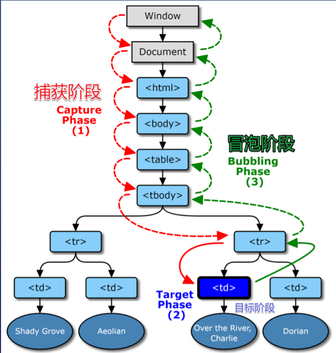 第一阶段:从window对象传导到目标节点(从外到内),称之为"捕获阶段";