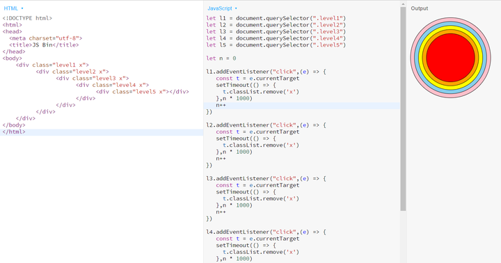 (点击目标,会以冒泡的形式从内到外依此变色,使用定时器使这个过程更加形象,如果不适用定时器,那么变色几乎使同一时间我们通过肉眼无法看出,但可以在不同目标的点击事件函数上添加console也可以看到变化)