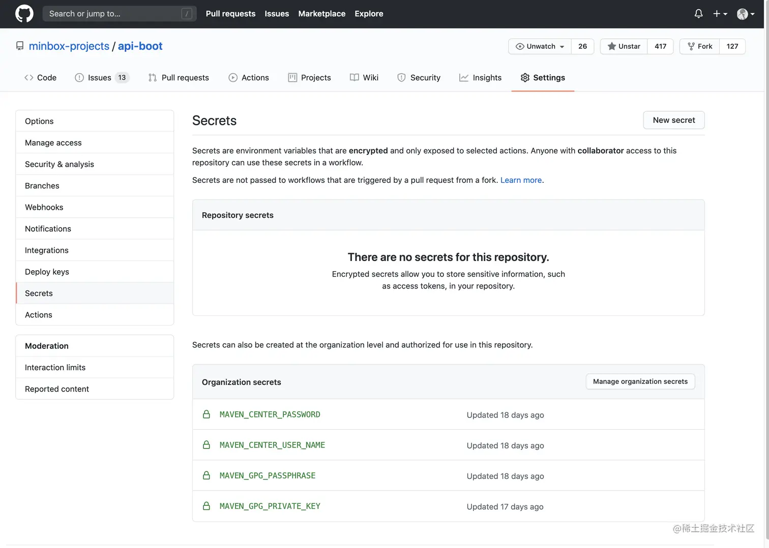 secrets为前缀,而后面的变量名必须与GitHub内的配置一致,如果你的相关Secrets配置需要用于多个项目,可以在组织下进行配置。
