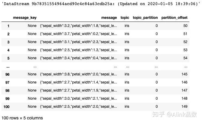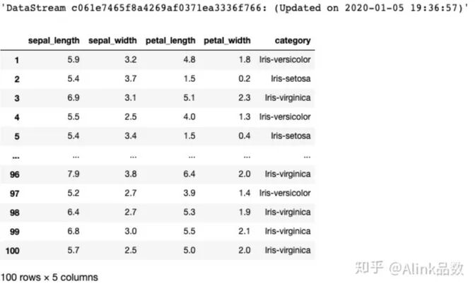 执行显示结果如下,PyAlink 对于流式数据的打印,是按一定的时间间隔,每次显示若干条(默认是100)。