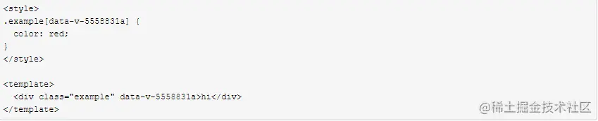 即:PostCSS给一个组件中的所有dom添加了一个独一无二的动态属性,然后,给CSS选择器额外添加一个对应的属性选择器来选择该组件中dom,这种做法使得样式只作用于含有该属性的dom——组件内部dom。