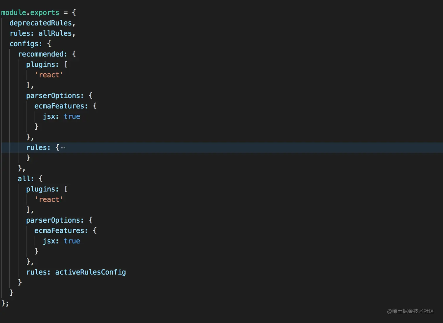 还是以上述的eslint-plugin-react为例,它实现了几十种配置规则,为了方便其他人使用,它默认实现了两种最佳实践all以及recommened(在configs中可以看到具体的名称)