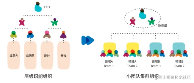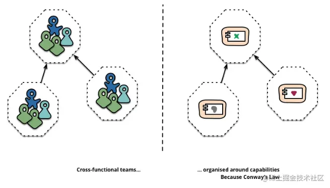 原先那种职能型的团队,变成了跨职能的小团队,这种团队和微服务架构对齐。