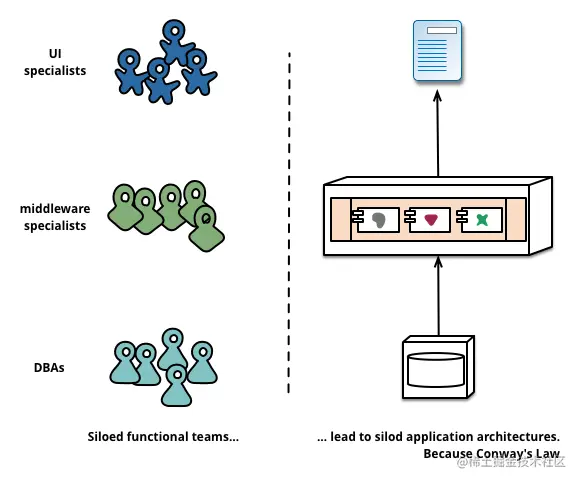 它是一个整体式的应用团队,每个团队按照职能来进行划分(图片左半部分),比如:UI团队,中间件团队,DBA团队。