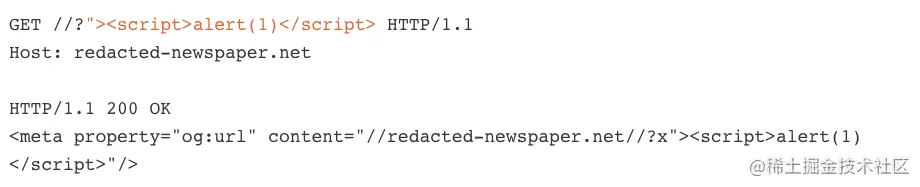 可以看到,响应中将请求头X-Forwarded-Host的值直接拼接到meta标签的content属性中了,这是很明显的一处反射型xss