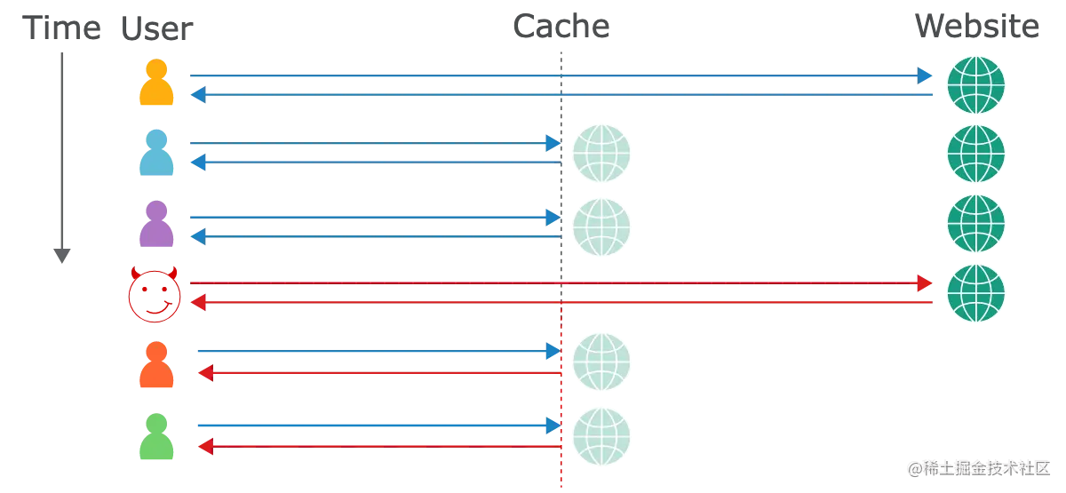 而另一个则是把请求过的资源暂且放在一个专门的缓存服务器上,例如CDN,这样,当下一个用户访问同样的资源时就可以直接从缓存服务器上拿到响应,从而减轻Web服务器的压力