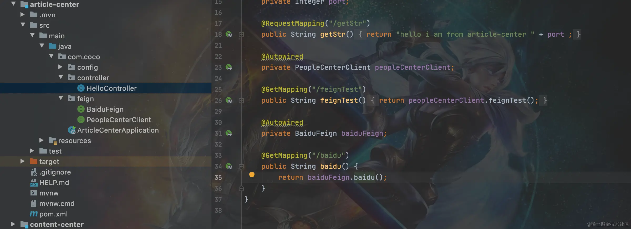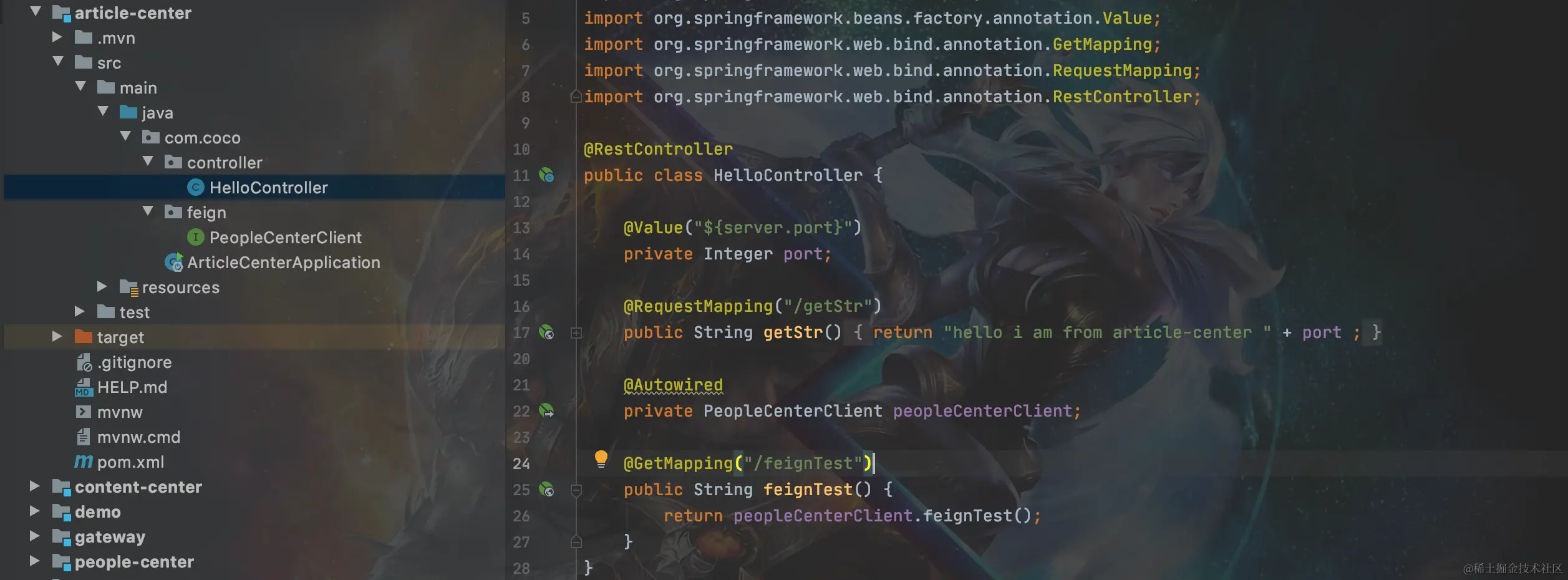 还是基于上次创建的二个项目article-center和people-center,上次整合了Ribbon,这次来整合Feign。