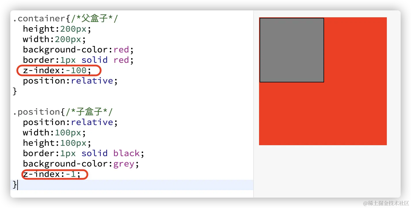 倘若父元素的z-index为默认auto的情况下,那么设置z-index:1的元素肯定比设置-1的元素要高,这是符合z-index基本顺序的,并且设置z-index:-1的元素会脱离父元素的层叠上下文,也就是会比父元素的background还要低。